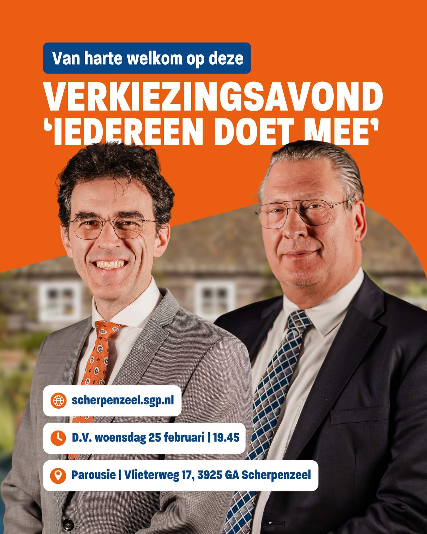 IEDEREEN DOET MEE! | Op D.V. woensdag 25 februari bent u van harte welkom op een informatieve en toegankelijke avond over de gemeenteraadsverkiezingen 2026 met het thema ‘Iedereen Doet Mee’. De inloop is om 19.45 uur met koffie, thee en appeltaart van Parousie, en om 20.00 uur start het programma.